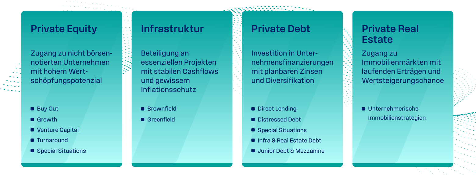 Als aktiver Asset Manager investieren wir bereits seit Jahrzehnten erfolgreich in alle Private Markets-Segmente: