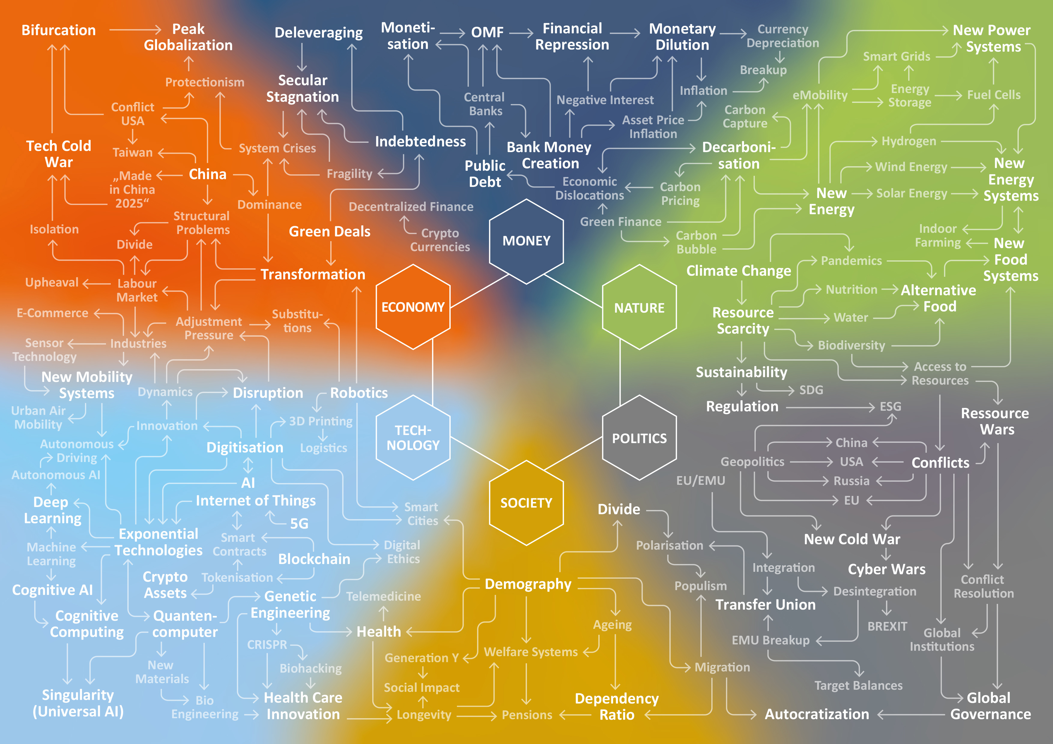 Identifying and analyzing the trends that will shape the world of tomorrow: that is our mission at the FERI Cognitive Finance Institute. As FERI’s strategic think tank, our job is to fill in the blind spots in the capital markets and reveal the long-term developments and megatrends that really matter. Our interdisciplinary analysis explores six central areas of knowledge (“cognitive domains”): money, nature, politics, society, technology and the economy.