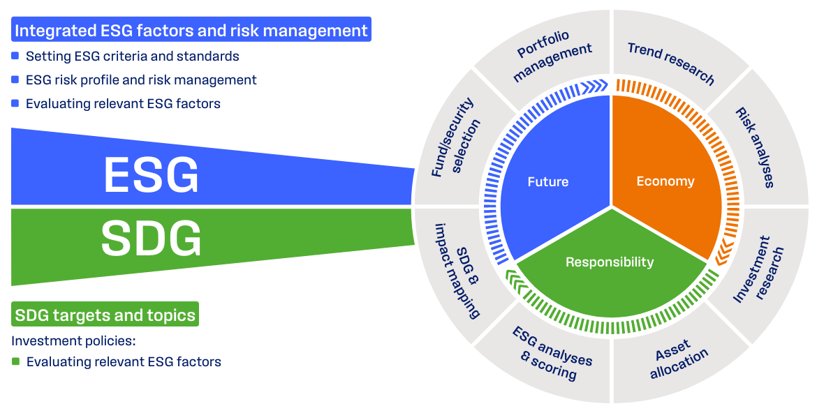 The United Nations Sustainable Development Goals (SDGs) and the ESG (environmental, social and governance) criteria form the basis for our constructive, joined-up approach to sustainability. Sustainability factors are fully integrated into our investment decisions, which target steady financial performance and long-term value.