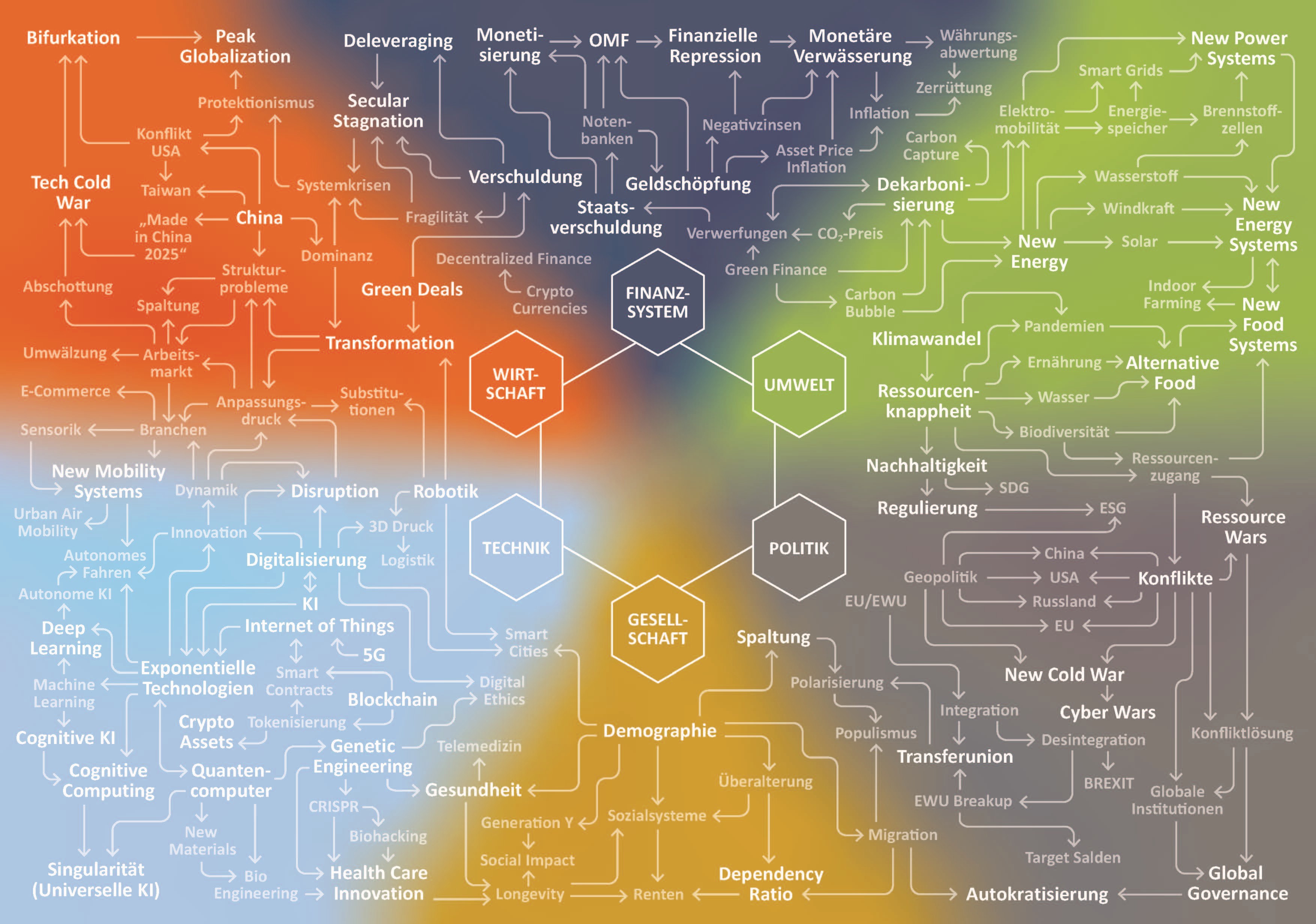 Für den Blick in die Zukunft kommt die eigens entwickelte Cognitive Finance-Methodik zum Einsatz. Durch vernetzte Analyse der sechs Erkenntnisräume entsteht ein ganzheitliches Bild – das „Big Picture“. Dieses sowie die daraus abgeleiteten Szenarien dienen der frühzeitigen Identifikation und dem besseren Verständnis von zukünftigen Trends der globalen Wirtschaft, des Finanzsystems sowie der Kapitalmärkte. Unterstützt von einem hochkarätigen Expertennetzwerk entsteht so eine einzigartige Wissensplattform, auf der wegweisende Zukunftsszenarien mit hoher Prognosequalität bereitgestellt werden. Die gewonnenen Erkenntnisse nutzen wir nicht nur intern, sondern veröffentlichen sie auch in Form ausführlicher Studien, Analysen, Vorträge und Publikationen.