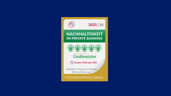Im Nachhaltigkeitsrating 2025 von FUCHS | RICHTER erreichte FERI als bester deutscher Anbieter 94,8 von 100 Punkten und wurde mit dem Siegel „Großmeister“ ausgezeichnet. Besonders gewürdigt wurden unser soziales Engagement sowie unsere unabhängige Produkt- und Nachhaltigkeitsanalyse.