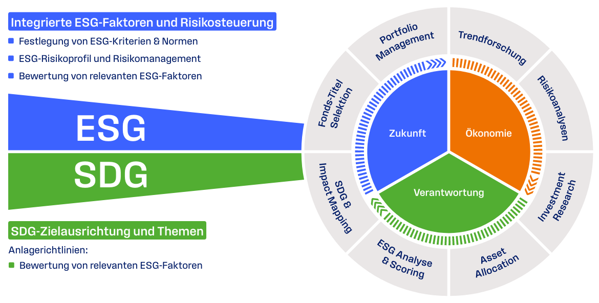 Unser Ansatz verbindet die Sustainable Development Goals (SDGs) der Vereinten Nationen mit den ESG-Kriterien (Environment, Social, Governance) und schafft so eine konstruktive und integrierte Nachhaltigkeitslogik. Wir integrieren Nachhaltigkeitsfaktoren in unsere Investmententscheidungen.